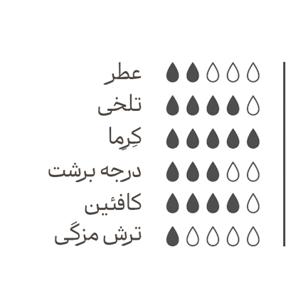کافئین و غلظت نسبتا زیاد، تلخی متوسط با عطر و طعم های شکلات تلخ و آجیل برشته شده برای افرادی که در نوشیدنی خود به دنبال انرژی در کنار تلخی کم هستند، مناسب است.