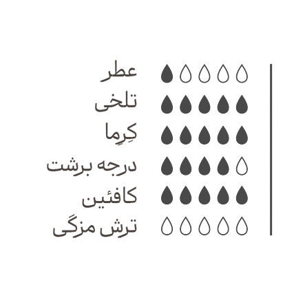 کافئین بسیار زیاد که برای همگــان توصیــه نمی شود، تلخــی زیـاد ولــی  خوشایند در کنار غلظتی بی نظیــر با انرژی بسیــار زیـاد برای علاقه منــدان به طعم قهوه های تلخ با انرژی بالا مناسب است.